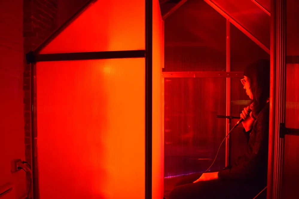 The Tuning House is a light and sound room where voice is translated into sound and color. As you hum, tone, and sing into the microphone, the colors and sounds in the room change following the pitch of your voice.